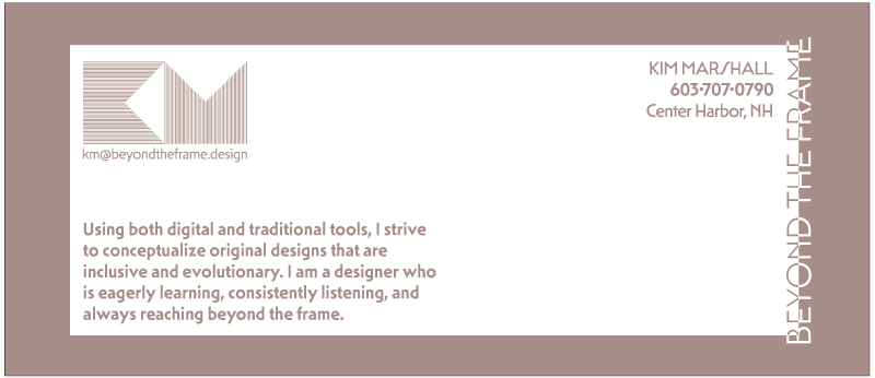 Beyond the frame describes my approach to design challenges and my desire to seek unique solutions. It illustrates that I see things in ways that break the barriers of tradition. In contrast to the cliché, “outside the box,” which implies complete separation, beyond the frame is about pushing the boundries—staying connected to the art, while also reaching beyond it.
